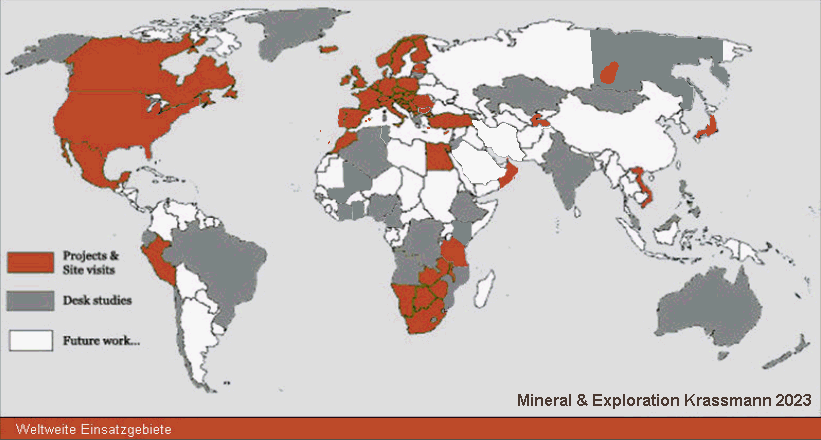 Seit 1993 sind wir in den Bereichen Mineralische Rohstoffe, Exploration, Bergbau und Hydrogeologie tätig. In diesen 30 Jahren haben wir weit über 200 verschiedene Projekte in zahlreichen Ländern erfolgreich bearbeitet. Die Weltkarte zeigt Ihnen unsere bisherigen Einsatzgebiete. Für Rückfragen stehen wir Ihnen gerne zur Verfügung.